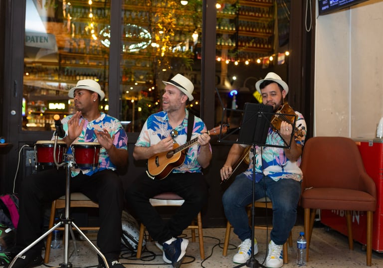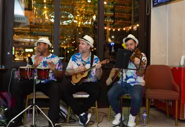 Se fazemos negócios com leveza, não poderia faltar uma banda havaiana Ao Vivo, formada por Bongo, Ukulelê e Violino tocando clássicos como "What a Wonderful World" e "Beautiful Day". No volume certo, aquecemos corações e almas para que negócios fluam com leveza e impacto!
