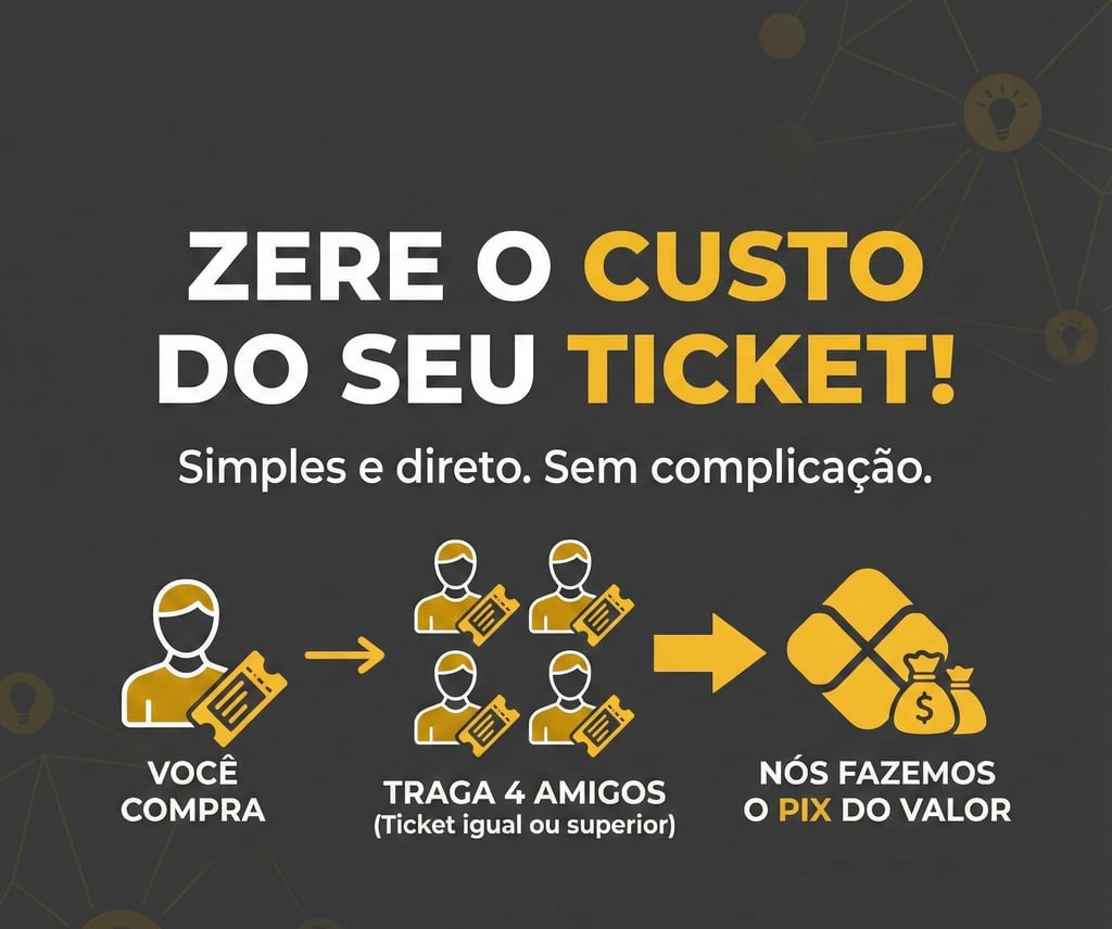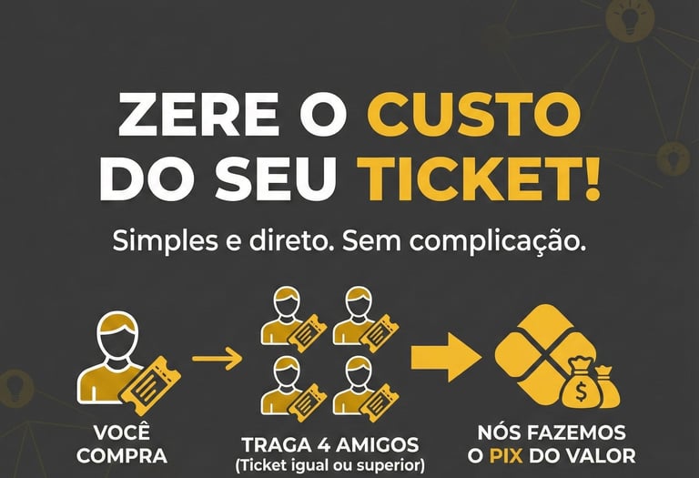 Ao adquirir seu ticket PRÓ (ou superior) e trazer +4 amigos que comprem o mesmo nível ou acima, o valor do seu convite retorna em PIX. Sem pontos que você não entende ou brindes que não quer: dinheiro na conta!