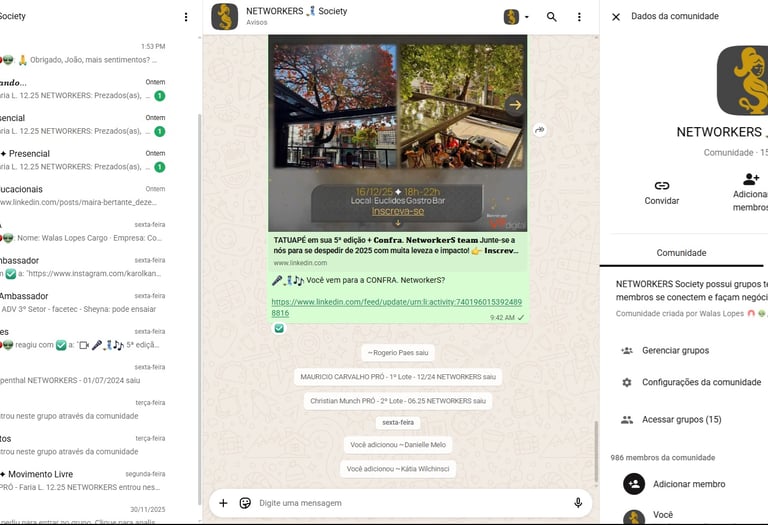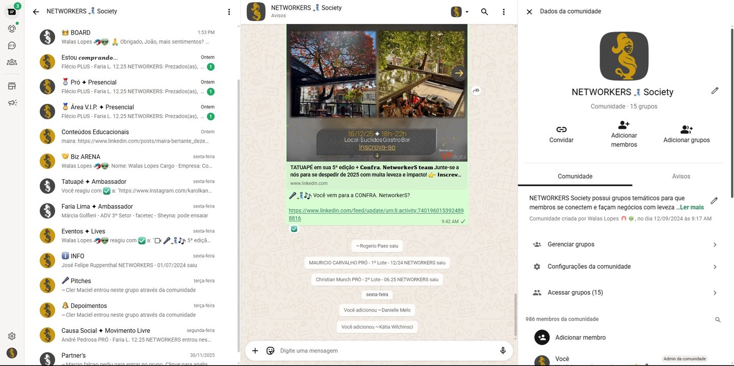 Comunidade com dezenas de grupos, +1.5k membros e crescendo. Conecta pessoas para gerar negócios em subgrupos de interesse mútuo, como Business Matches, Conteúdos, Eventos e Causa Social.